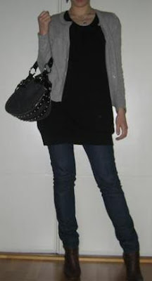 Ekana Naf Naf:in pikkumusta kiiltonahka patellavyöllä ja Zaran kengillä höystettyinä. Aika perus mutta varma valinta kuitenkin..